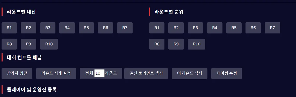 다양한 프로그램을 통해 이벤트 진행자와 참가자가 어려움 없이 대회에 참가하고 경기에 집중할 수 있는 시스템을 제공합니다. 이 도구에는 참가 등록 도구, 무작위 대진 상대 구성 도구, 순위표 자동 계산 및 게시 도구 등이 포함됩니다.