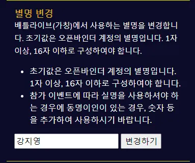 별명 변경에서 원하는 별명을 입력하기 “변경하기” 버튼을 누릅니다.