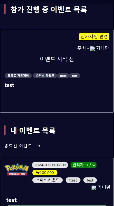 참가 등록한 시작하지 않은 미래의 이벤트를 보여주며, “종료된 이벤트” 페이지에서는 과거에 참여한 이벤트를 보여줍니다.