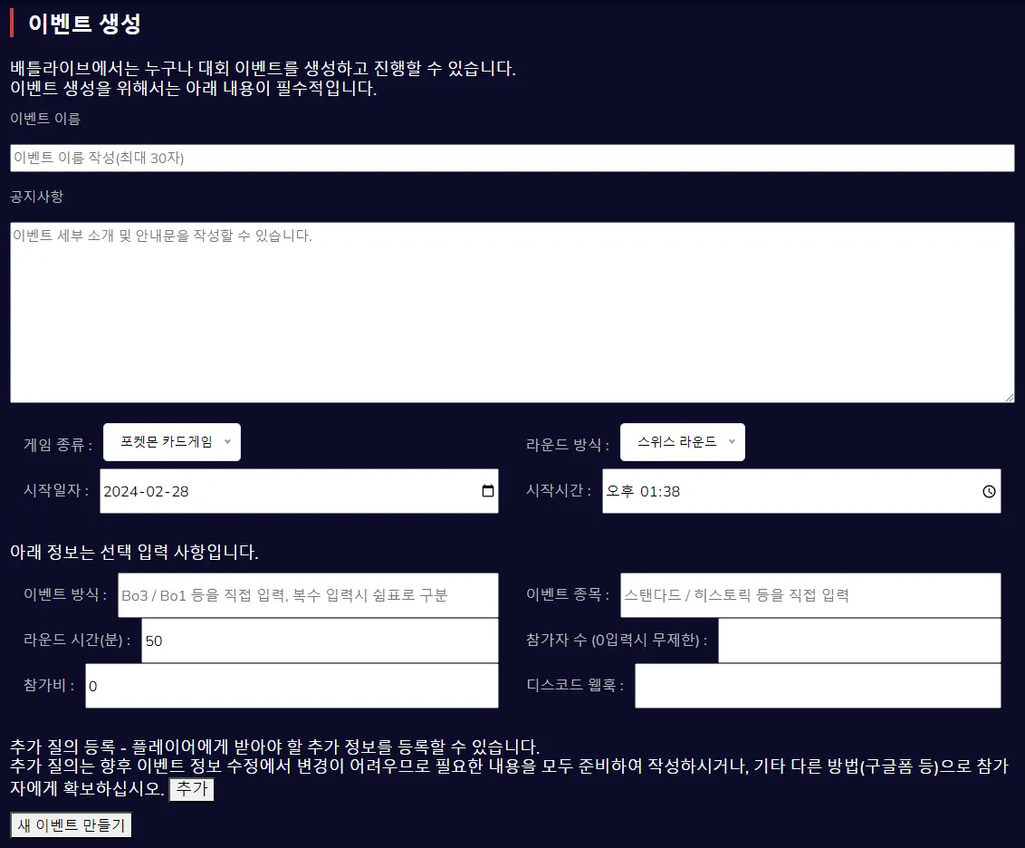 이벤트 이름, 공지사항, 게임 종류, 라운드 방식, 일자 및 시간을 입력은 필수 입력 요소입니다.