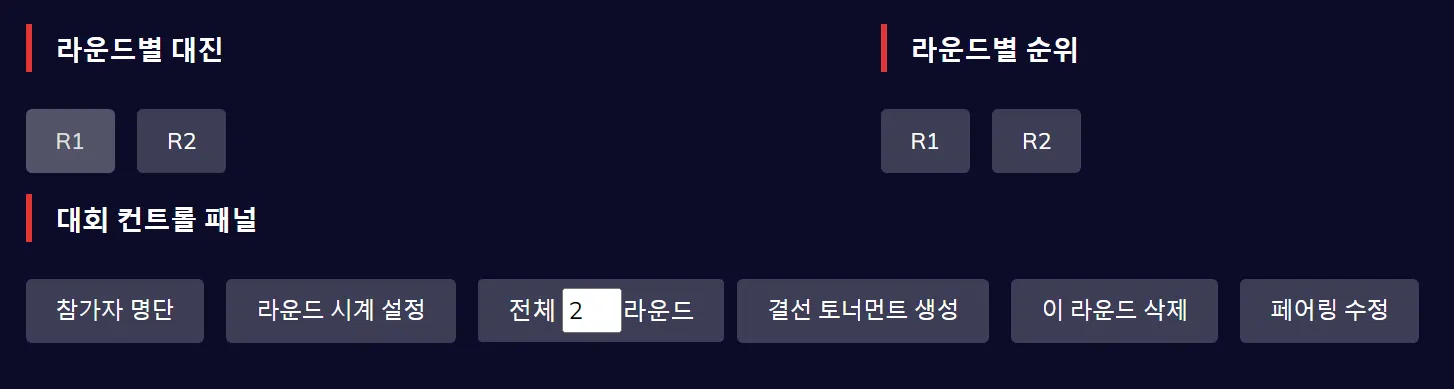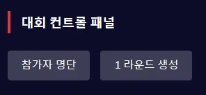 첫 번째 라운드를 시작해봅시다. 대회 컨트롤 패널에서 “1라운드 생성” 버튼을 누르면 무작위로 대진이 생성됩니다.