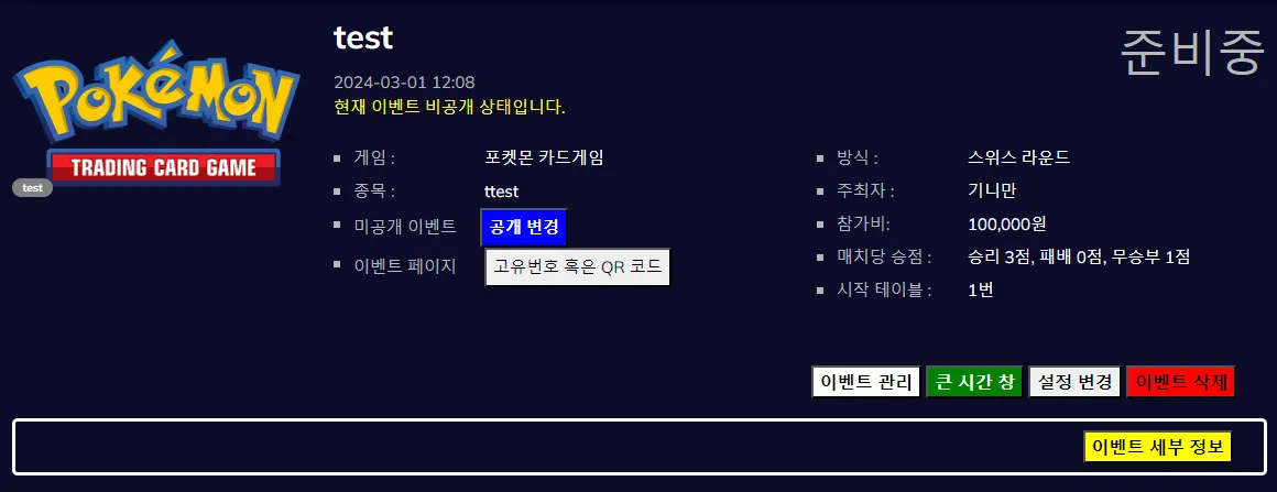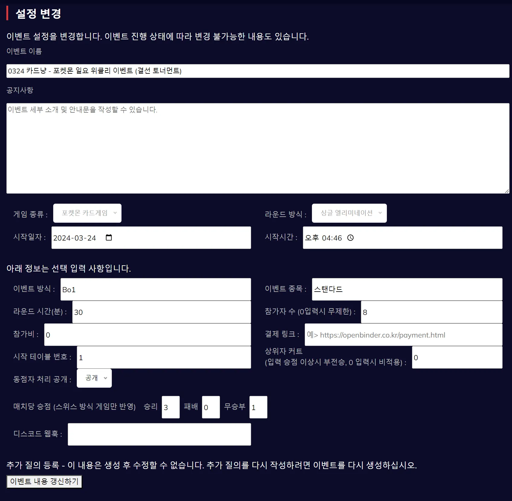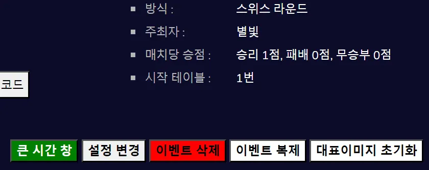 이벤트 방식, 종목, 라운드 시간, 참가자 수, 참가비 등은 기존의 새 이벤트 생성과 같습니다.
