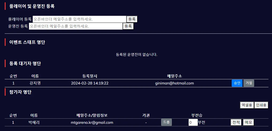 플레이어가 직접 참가 등록을 하면, “등록 대기자 명단”에 오르게 됩니다. 여기에서 승인하시면 “참가자 명단”으로 이동합니다. 참가자 명단에 있는 플레이어가 실제 이벤트에서 대진표 구성에 들어갑니다.