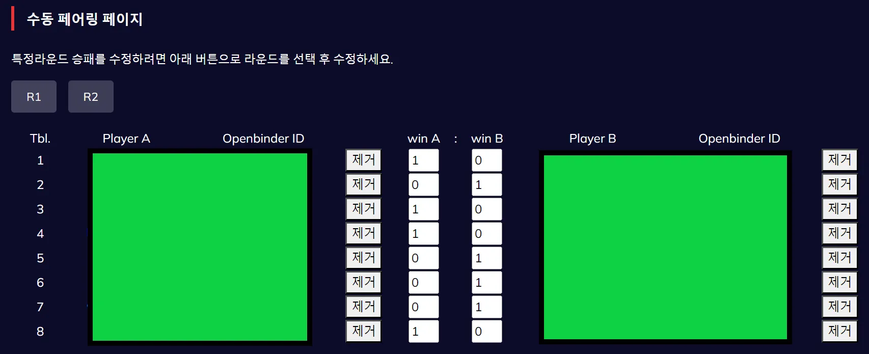 수동 대진을 만드시려면, 페어링 수정 페이지를 여시고, “제거” 버튼을 모두 눌러서 모든 테이블의 상대를 제거합니다. 그러면 플레이어 배정이 없는 테이블의 자리에는 선택상자가 생기며, 여기서 플레이어 이름을 확인한 뒤 클릭하면 그 자리에 배정하게 됩니다.