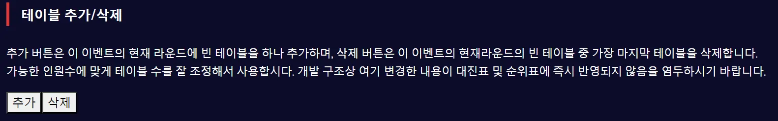 참가등록에서 이 참가자를 참가시키면 이벤트에는 등록이 되나, 당장 현재 라운드에 대진을 매칭시켜 진행하여야 합니다. 이를 위해 추가 테이블을 생성할 수 있는 기능이 있습니다.