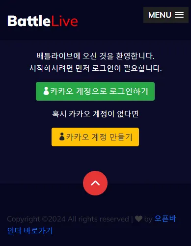배틀라이브를 사용하려면 로그인이 필요합니다. 로그인은 카카오 계정을 통해 진행하며, 카카오 계정이 없는 사용자는 계정을 생성하셔야 합니다. 최초 로그인시 카카오를 통해 동의사항 선택을 진행하게 됩니다. 필수사항만 동의해주시면 됩니다.