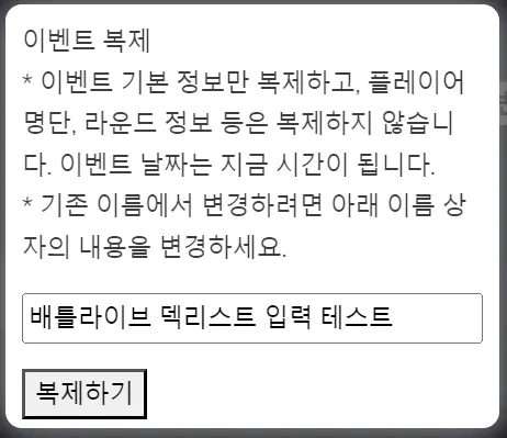 이벤트 복제는 이벤트의 기본 정보를 모두 복제하나, 플레이어 목록, 스태프 목록, 라운드 결과 등을 복제하지 않습니다. 복제된 기본 정보도 새로이 생성된 이벤트의 “설정 변경” 버튼을 통해 세부 정보를 변경할 수 있으니 활용하시면 됩니다.