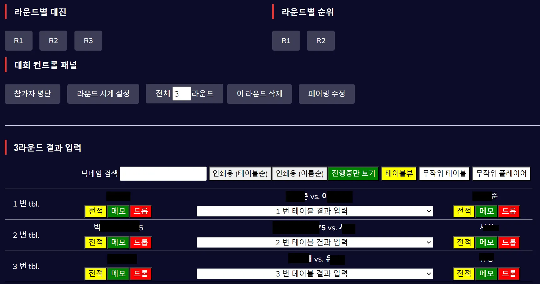 모든 테이블의 결과가 입력되면, “대회 컨트롤 패널”의 메뉴가 약간 바뀝니다. “다음 라운드 생성” 버튼이 등장하며, 이 버튼을 누르면 현재 결과를 반영하여 다음 라운드 대진을 구성해줍니다. 첫 번째 라운드와 마찬가지로 똑같이 진행하시면 됩니다.